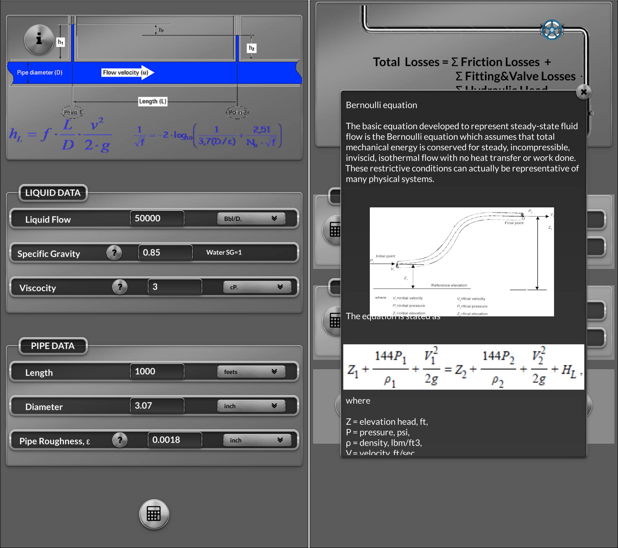 Calculate Pressure Drop due friction losses in pipes and "minnor losses" due fittings and hydrostatic head for incompressible and compressible fluids.